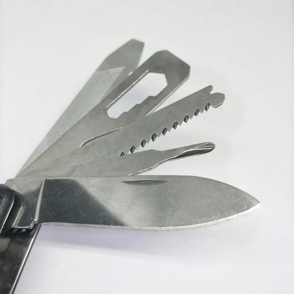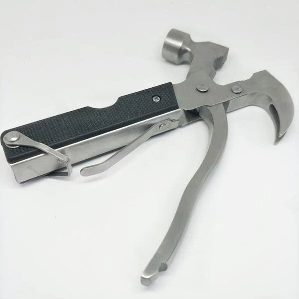 Es compacto y ligero, está hecho de acero inoxidable, con herramientas domésticas útiles como un martillo, alicate, abrebotellas, cuchillo, sierra, destornilladores, llave inglesa, lima y cortadores de alambre.