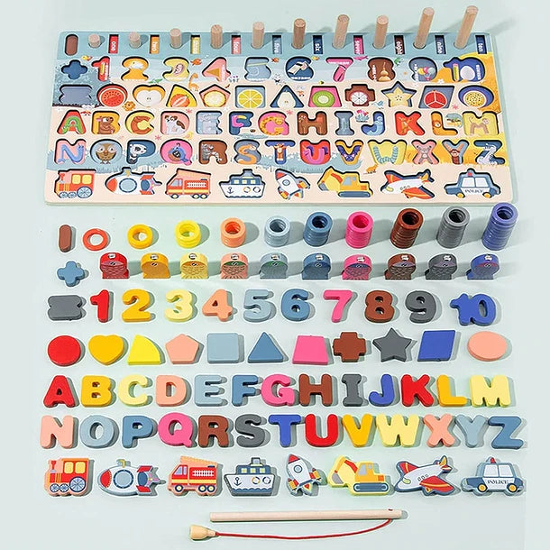 Tabla de madera educativa para niños, ayudará de forma didáctica a su hijo y lo acompañará durante sus primeros años. Esta tabla reúne un juego de pesca magnético, un rompecabezas de madera con las letras del alfabeto, así como los números del 0 al 10, formas y símbolos matemáticos, anillos apilables tipo ábaco para que los niños desarrollen su lógica y habilidad.