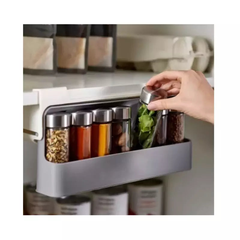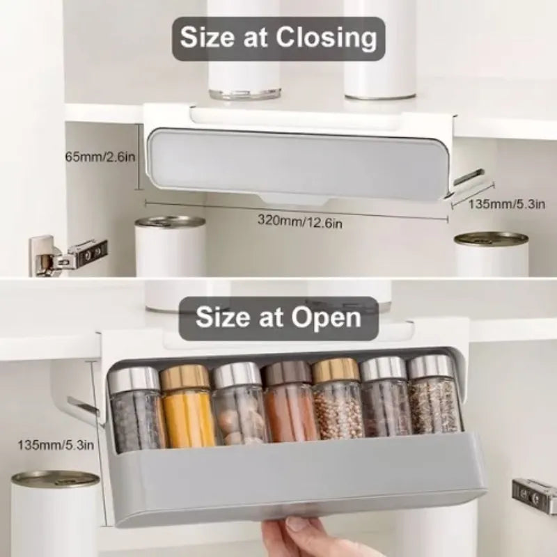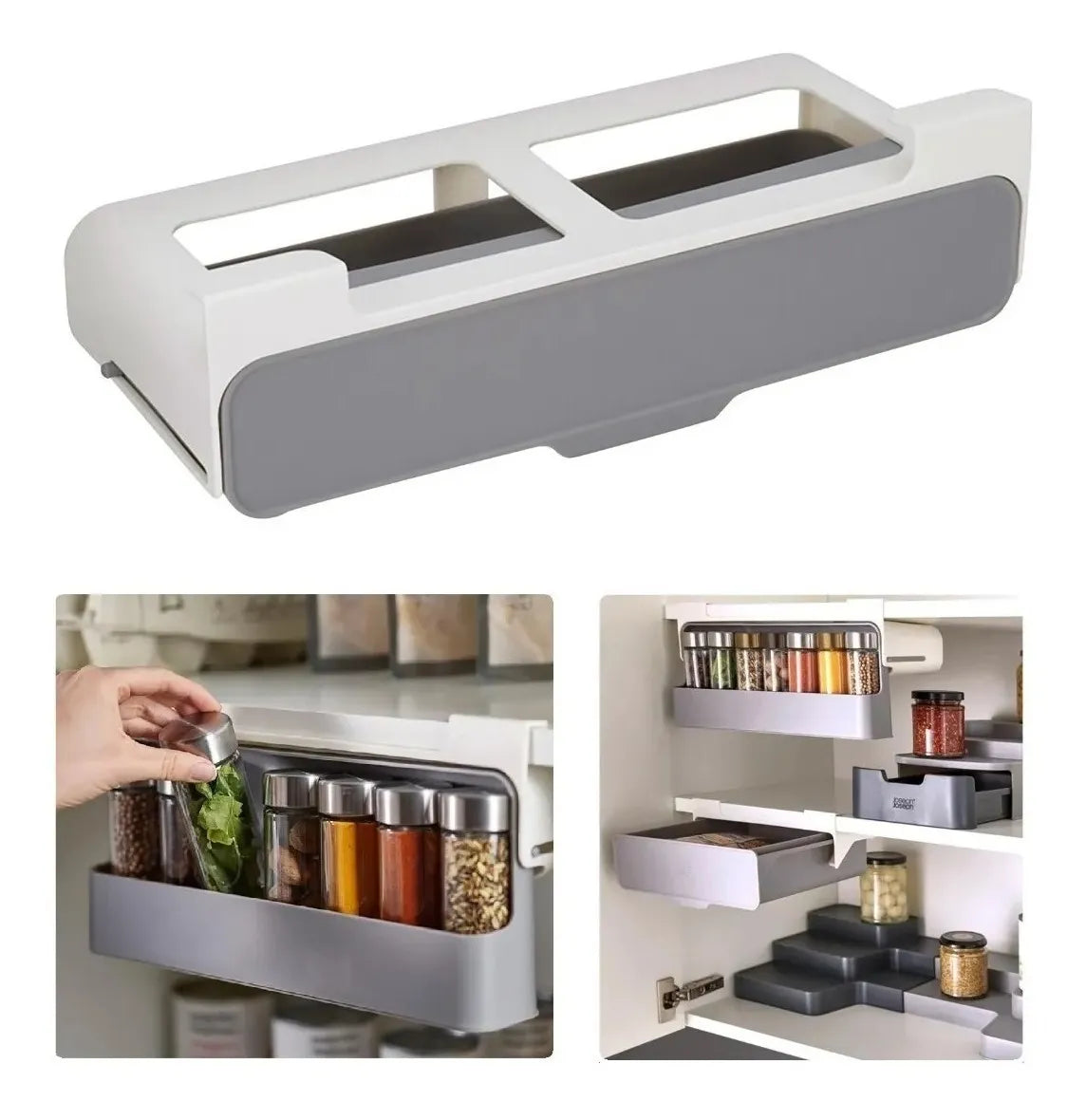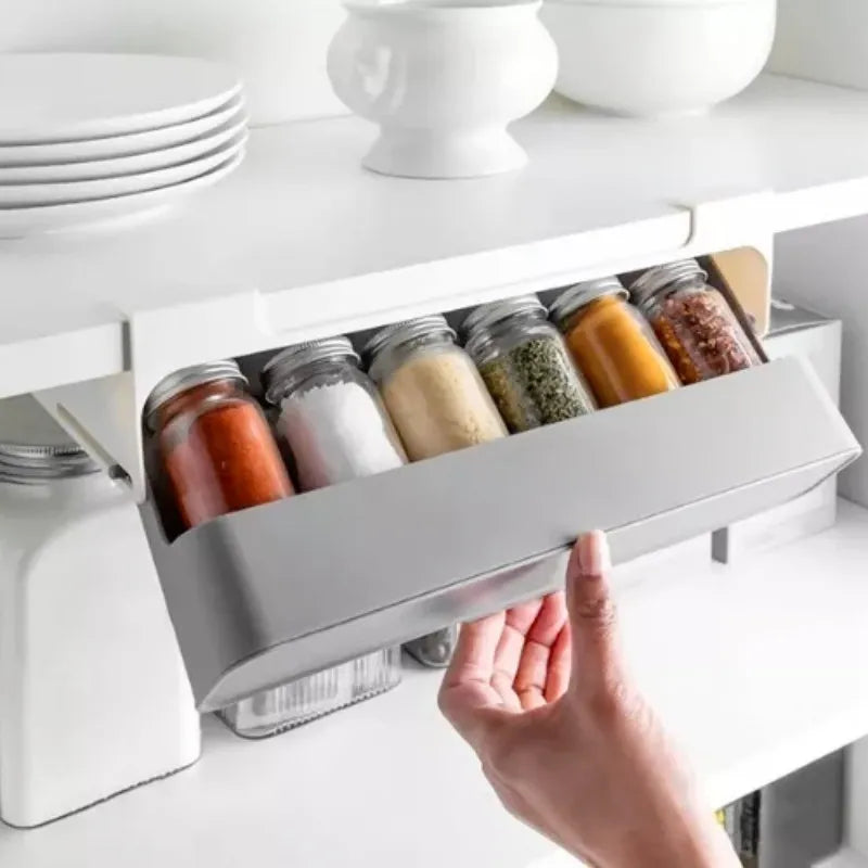 Su instalación es sencilla no requiere de herramientas, se monta fácilmente en su estante. Quedando un compartimento fácil de extraer con tope de cajón, con capacidad para almacenar hasta 7 tarros de especias.